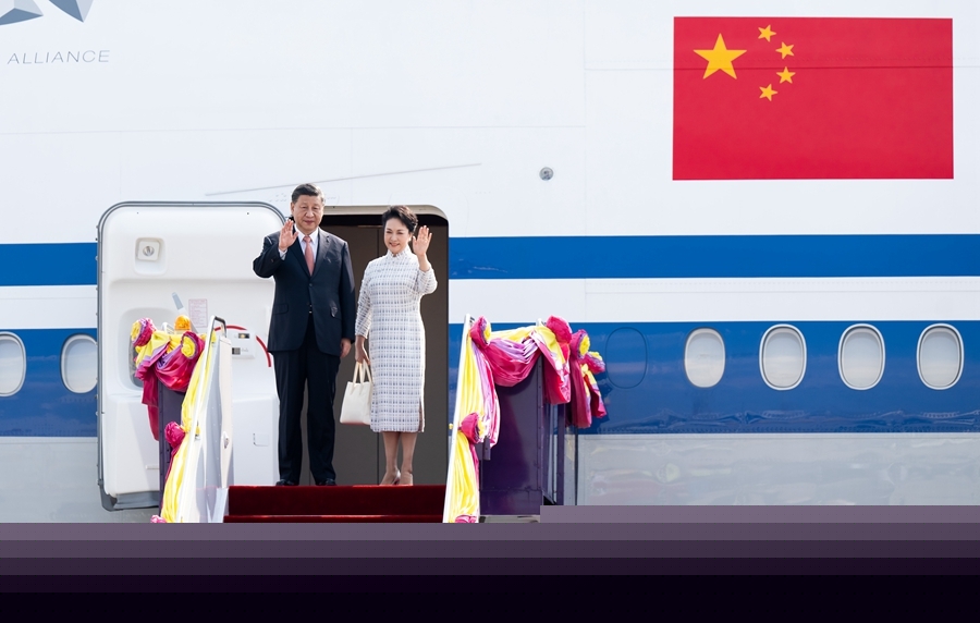 當地時(shí)間11月17日下午,國家主席習近平乘專(zhuān)機抵達泰國曼谷,出席亞太經(jīng)合組織第二十九次領(lǐng)導人非正式會(huì )議并對泰國進(jìn)行訪(fǎng)問(wèn)。這是習近平和夫人彭麗媛乘坐的專(zhuān)機抵達曼谷素萬(wàn)那普國際機場(chǎng)時(shí),泰國總理巴育夫婦、副總理兼外長(cháng)敦夫婦、文化部部長(cháng)伊提蓬夫婦等熱情迎接。新華社記者 殷博古 攝