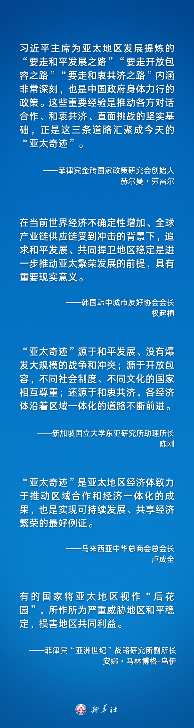 對于亞太未來(lái)發(fā)展繁榮,習近平主席提出重要主張:要攜手構建亞太命運共同體,再創(chuàng )亞太合作新輝煌。多國人士認為,“維護國際公平正義,建設和平穩定的亞太”“堅持開(kāi)放包容,建設共同富裕的亞太”“堅持綠色低碳發(fā)展,建設清潔美麗的亞太”“堅持命運與共,建設守望相助的亞太”為亞太地區未來(lái)發(fā)展指明了方向和路徑。