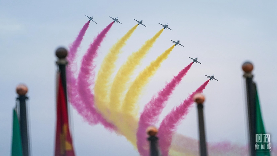△沙特禮賓護衛機在空中拉出象征中國國旗的紅黃兩色彩帶。(總臺國廣記者李晉拍攝)