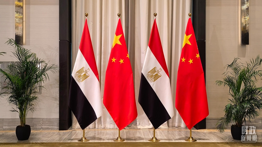 △會(huì )見(jiàn)現場(chǎng)的中埃兩國國旗。(總臺央視記者韓銳拍攝)