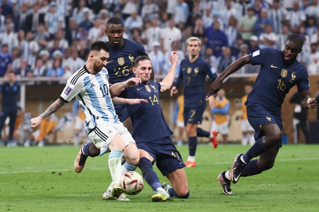 12月18日,阿根廷隊球員梅西(左一)與法國隊球員拉比奧(左三)在比賽中拼搶。新華社記者蘭紅光攝