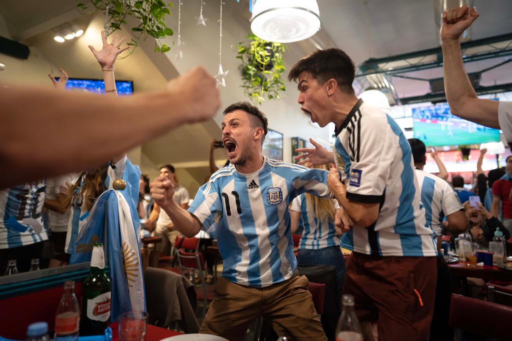 隨著(zhù)比賽的進(jìn)行,球迷們或歡呼,或惋惜,或慶祝,或咬緊牙關(guān)握緊拳頭盯著(zhù)屏幕。每一粒進(jìn)球、每一次射門(mén),阿根廷球迷都在萬(wàn)里之外,為球員們加油鼓勁,他們知道,阿根廷球迷的愛(ài)一直與在卡塔爾賽場(chǎng)上奔跑的阿根廷隊員在一起。