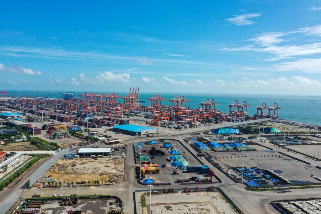 這是2022年8月27日拍攝的位于平陸運河出??诟浇谋辈繛掣蹥J州港區大欖坪作業(yè)區(無(wú)人機照片)。(新華社記者曹祎銘攝)