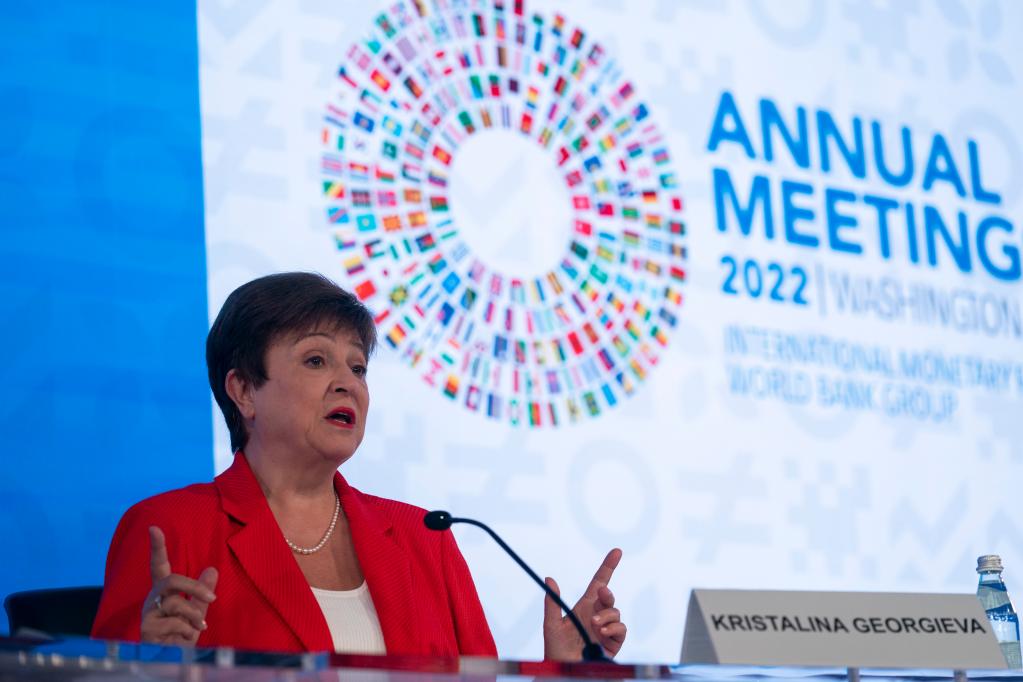 10月13日,在美國華盛頓,國際貨幣基金組織(IMF)總裁格奧爾基耶娃出席記者會(huì )。新華社記者劉杰攝