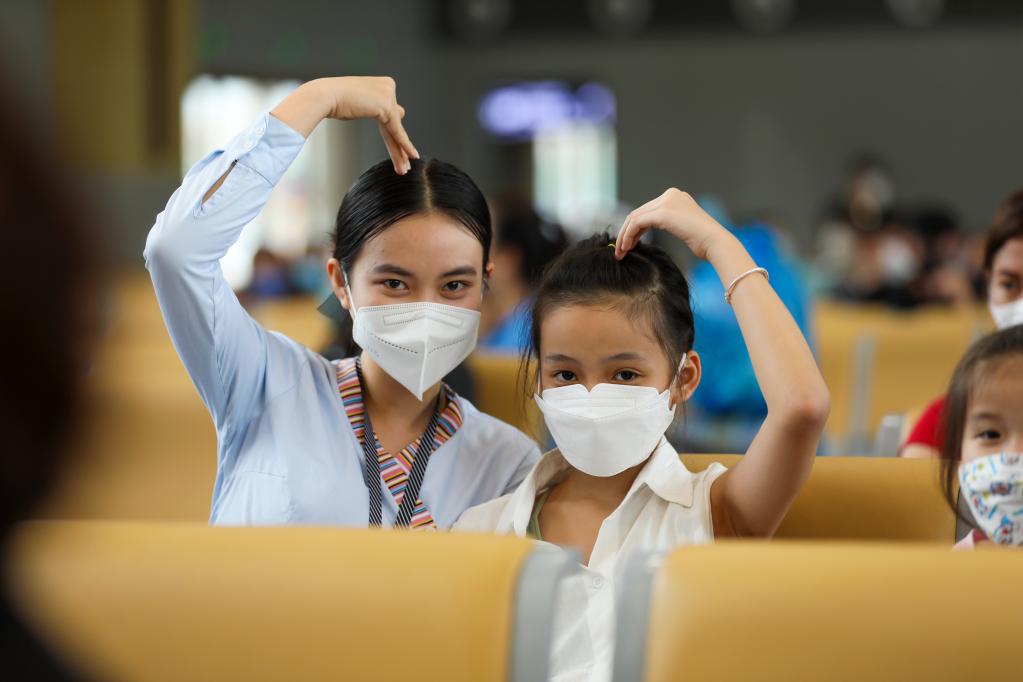 4月24日,在老撾瑯勃拉邦,中老鐵路員工與小乘客合影。新華社發(fā)(楊永全攝)
