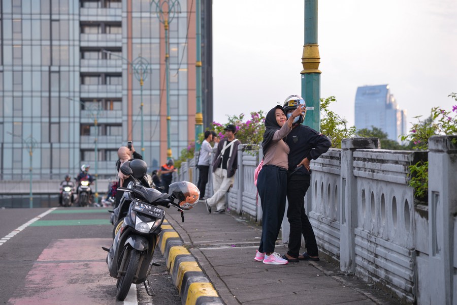 2023年1月1日,在印度尼西亞雅加達,人們在一座橋上留影。新華社記者徐欽攝