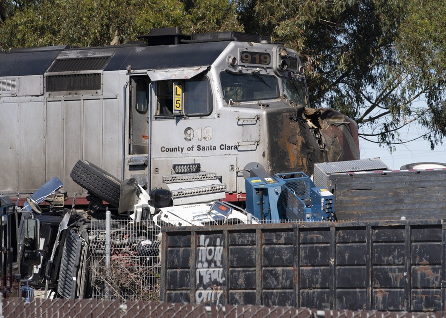 這是2022年3月10日在美國加利福尼亞州圣布魯諾拍攝的事故現場(chǎng)。美國加州圣布魯諾當天發(fā)生通勤列車(chē)與工程車(chē)輛相撞事故,造成13人受傷。新華社發(fā)(李建國攝)