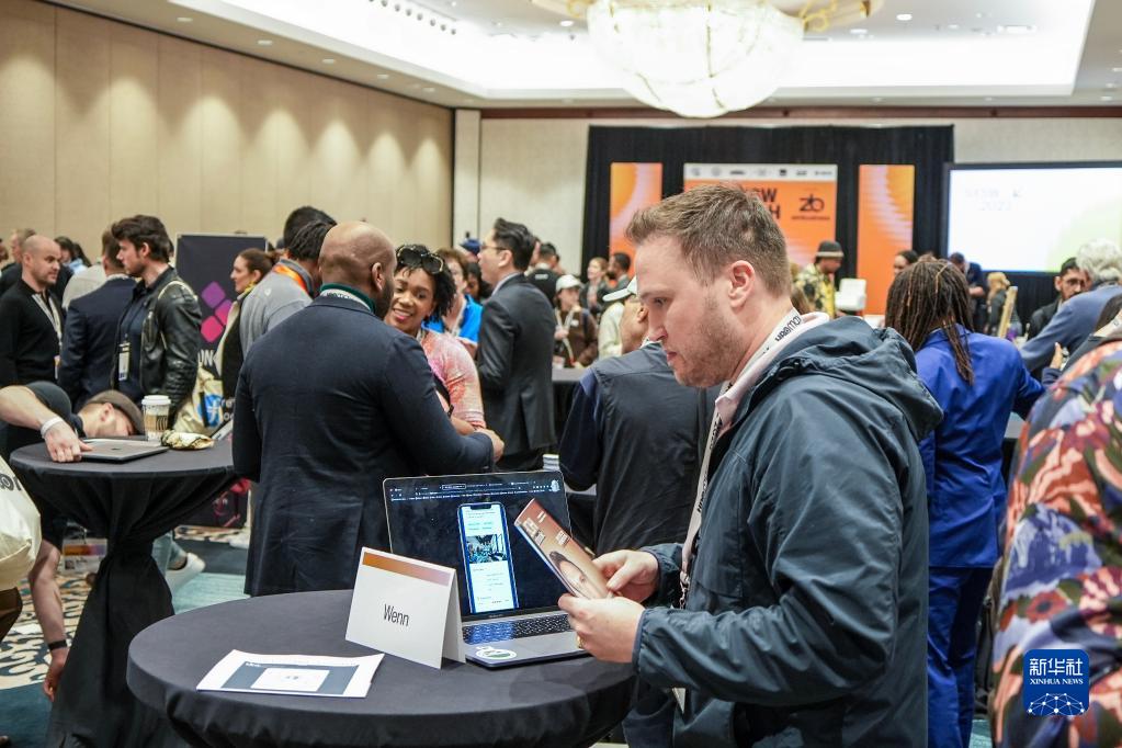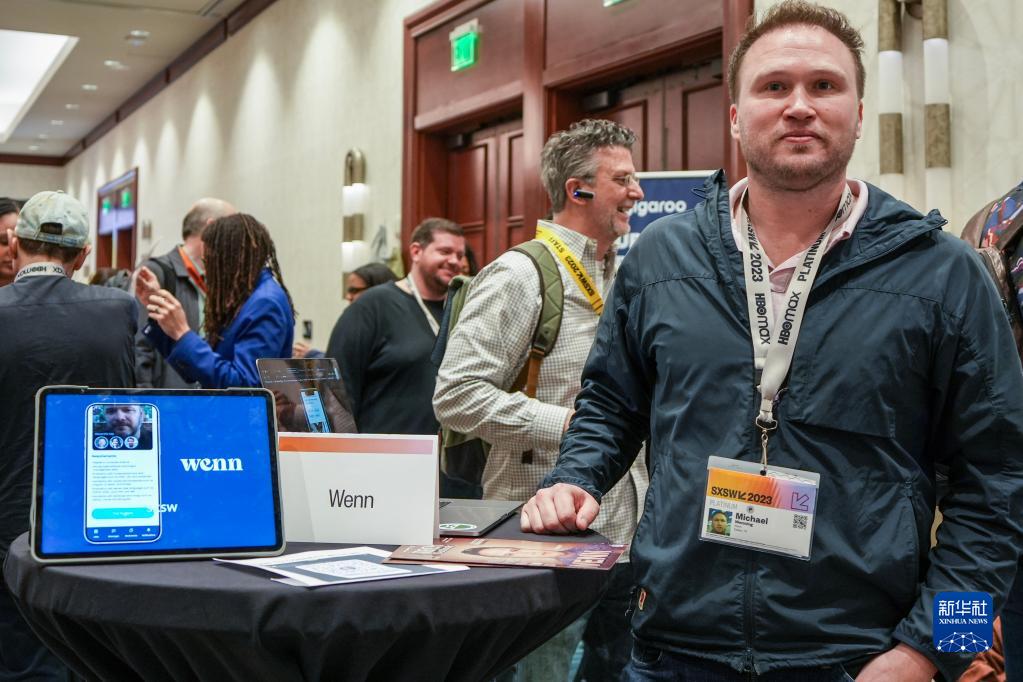 3月13日,在美國得克薩斯州奧斯汀,來(lái)自達拉斯的科技初創(chuàng )企業(yè)家邁克爾·溫寧(前)參加“西南偏南”大會(huì )。新華社發(fā)(李波攝)