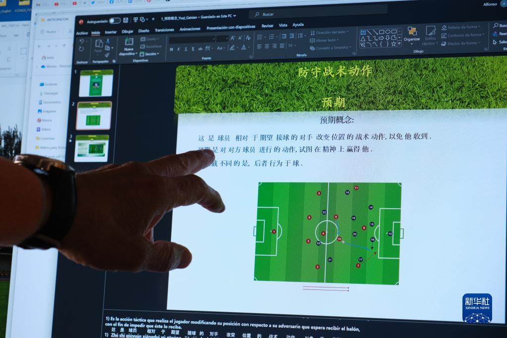 4月17日,阿方索在西班牙馬德里的家中展示自己翻譯的足球教案。新華社記者 孟鼎博 攝