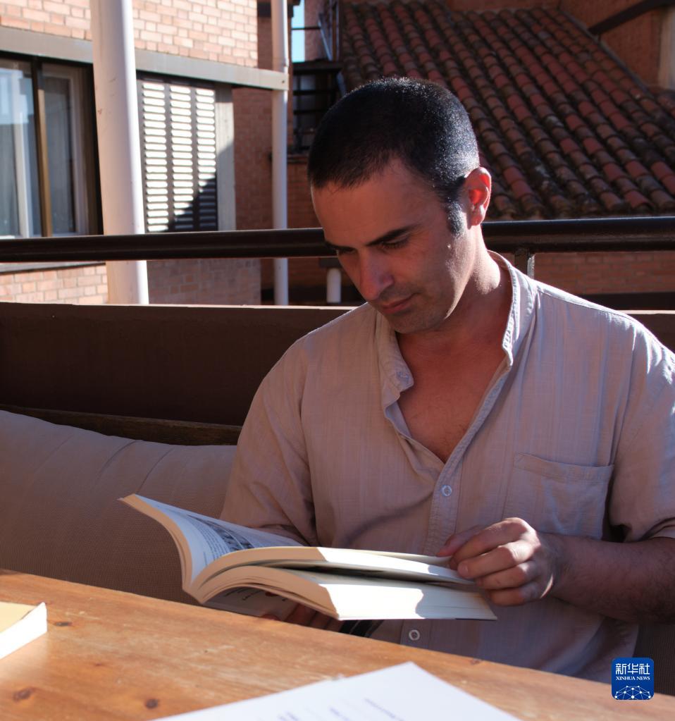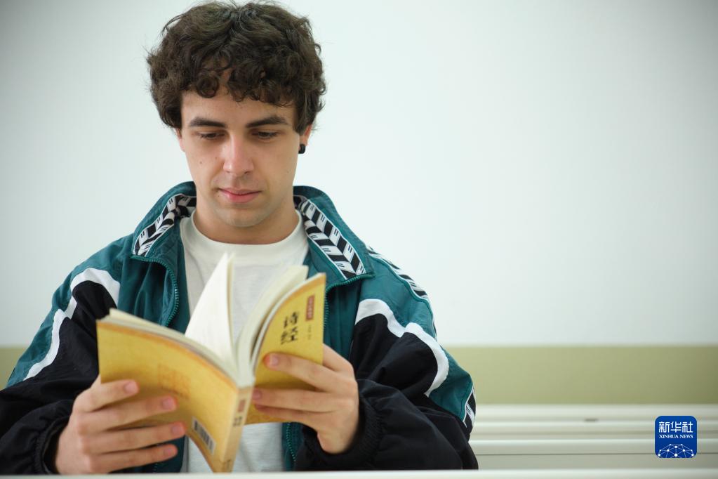 4月17日,胡里奧在西班牙馬德里自治大學(xué)的教室內閱讀詩(shī)經(jīng)。新華社記者 孟鼎博 攝
