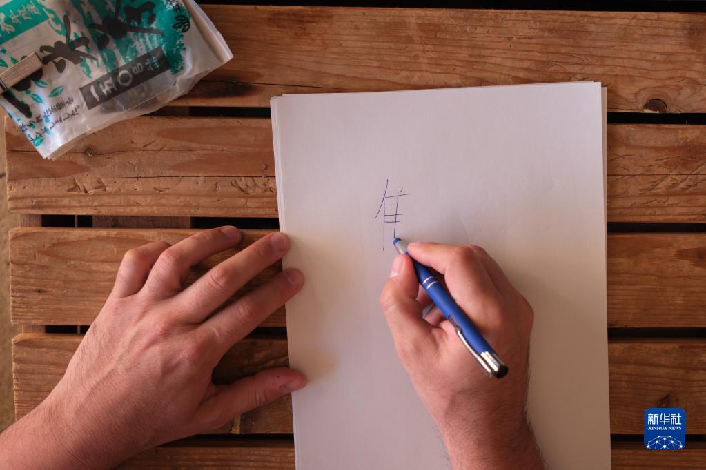 4月18日,米格爾在西班牙馬德里的家中書(shū)寫(xiě)漢字。新華社記者 孟鼎博 攝
