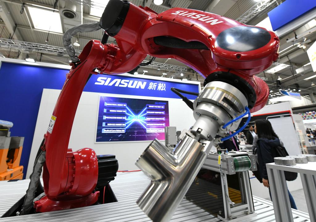 這是4月18日在漢諾威工博會(huì )上拍攝的新松工業(yè)機器人。新華社記者任鵬飛攝