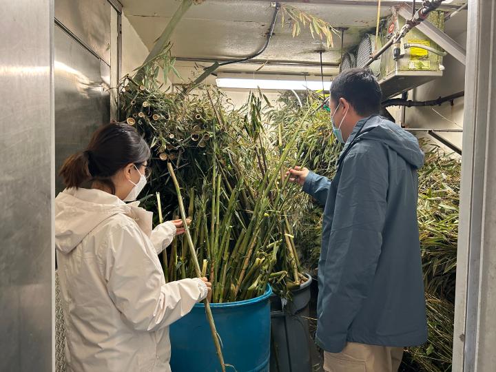 北京動(dòng)物園工作人員正在檢查“丫丫”食用的竹子 (4月12日攝)