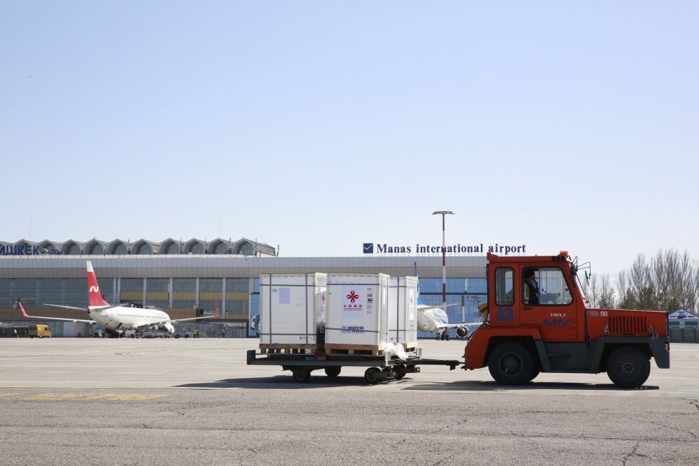 在吉爾吉斯斯坦比什凱克瑪納斯國際機場(chǎng),工人轉運新冠疫苗(2021年3月19日攝)。新華社發(fā)(羅曼攝)