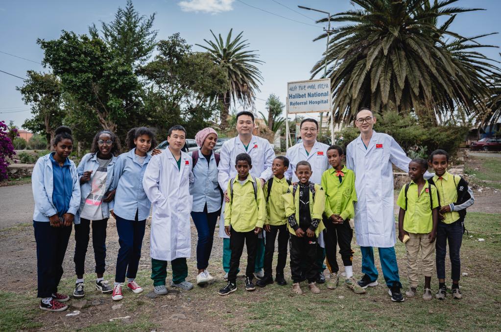 5月9日,在厄立特里亞首都阿斯馬拉的哈利貝特醫院門(mén)口,中國醫療隊隊員與附近學(xué)校兒童合影。新華社記者王冠森攝