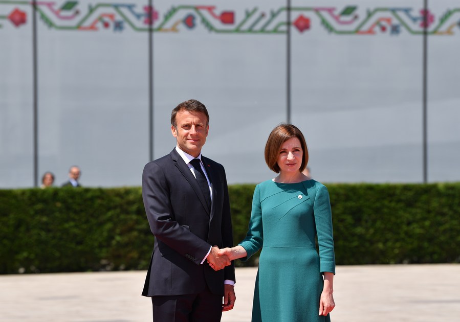 6月1日,在摩爾多瓦布爾博阿克,摩爾多瓦總統桑杜(右)歡迎前來(lái)參加第二屆歐洲政治共同體領(lǐng)導人會(huì )議的法國總統馬克龍。新華社記者連漪攝