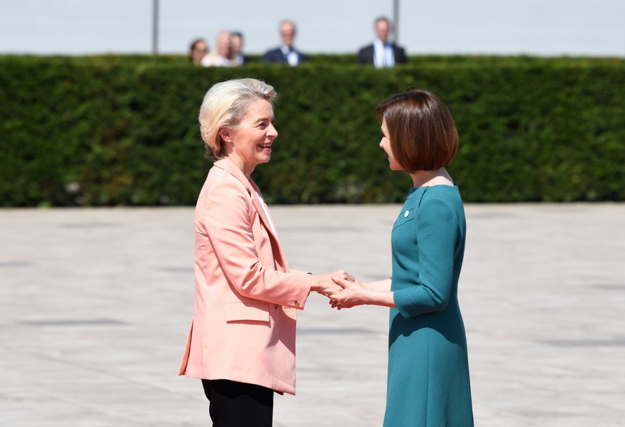 6月1日,在摩爾多瓦布爾博阿克,摩爾多瓦總統桑杜(右)歡迎前來(lái)參加第二屆歐洲政治共同體領(lǐng)導人會(huì )議的歐盟委員會(huì )主席馮德萊恩。新華社記者連漪攝
