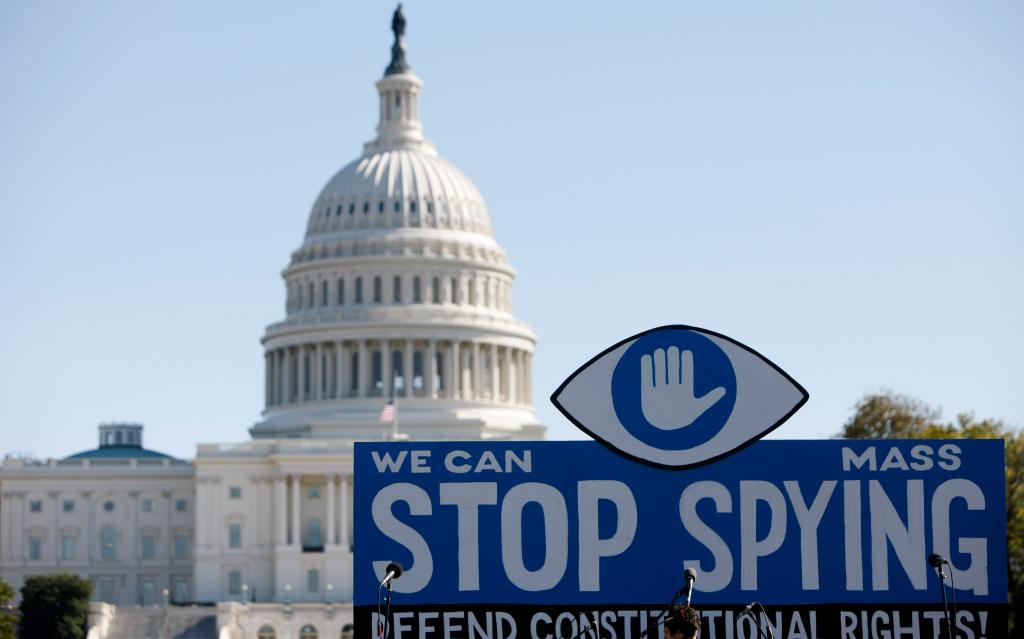 2013年10月26日,在美國首都華盛頓,一塊反監控的大型標語(yǔ)牌豎立在國會(huì )大廈前。新華社記者方喆攝