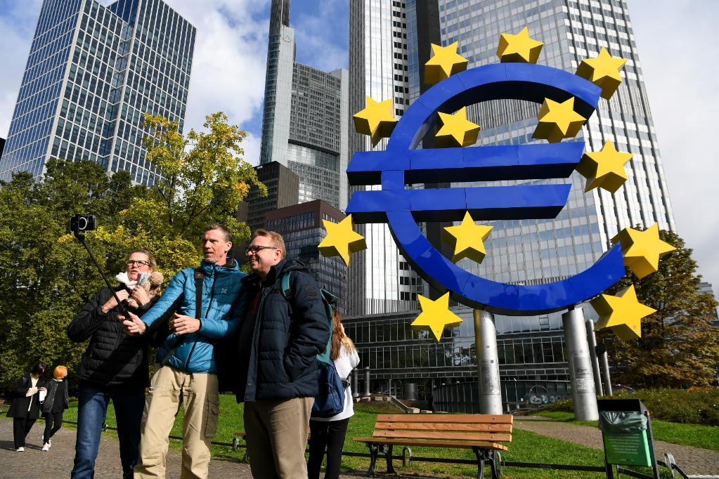 2021年10月13日,人們在德國法蘭克福歐元雕塑前自拍留影。新華社記者 逯陽(yáng) 攝