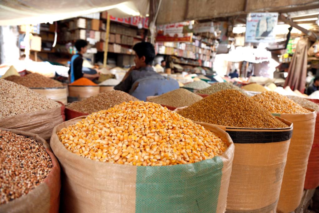 這是2022年6月29日在也門(mén)薩那拍攝的出售糧食的攤位。新華社發(fā)(穆罕默德·穆罕默德攝)