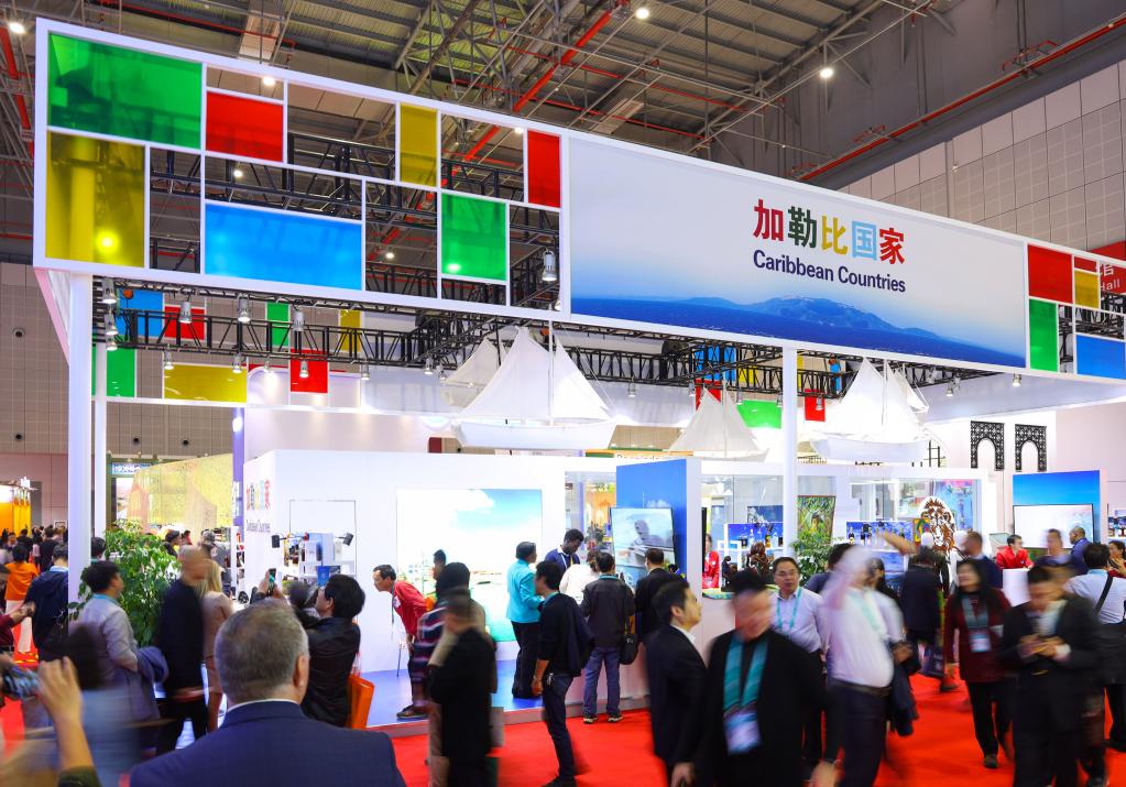 這是2018年11月6日在上海舉行的首屆中國國際進(jìn)口博覽會(huì )上拍攝的加勒比地區國家展區。新華社記者劉大偉 攝