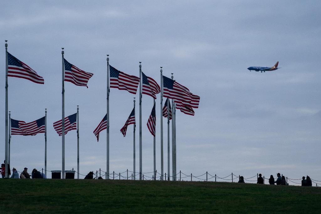 2022年11月10日,在美國首都華盛頓,一架飛機從美國國旗上空飛過(guò)。新華社記者劉杰攝