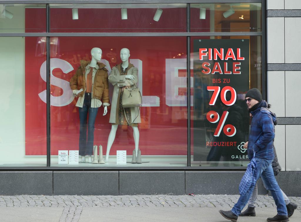 3月2日,在德國柏林,行人經(jīng)過(guò)一家打折店鋪。(新華社發(fā),斯特凡·蔡茨攝)