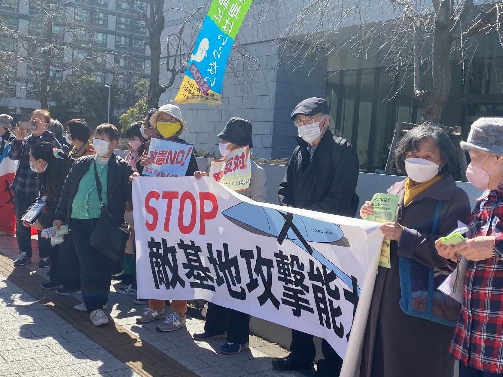 2月28日,在日本東京,日本民眾舉著(zhù)標語(yǔ)牌抗議日本眾議院通過(guò)高額的防衛費預算案。新華社記者郭丹攝