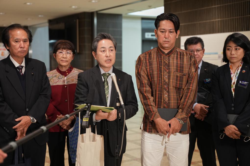 4月25日,在日本東京外務(wù)省,沖繩縣議員當山勝利(左三)接受記者采訪(fǎng)。日本沖繩縣議員代表團分別于4月24日和25日在首都東京向日本防衛省、日本內閣府和日本外務(wù)省遞交了該縣議會(huì )通過(guò)的和平外交意見(jiàn)決議書(shū),呼吁日本政府不要讓沖繩淪為戰場(chǎng),而應通過(guò)對話(huà)和外交方式和平解決問(wèn)題。新華社記者張笑宇攝