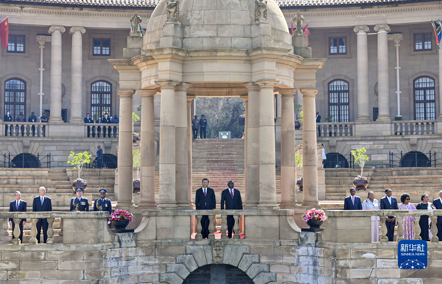 8月的比勒陀利亞,晴空萬(wàn)里,惠風(fēng)和暢??偨y府廣場(chǎng)鮮花盛開(kāi),中南兩國國旗迎風(fēng)飄揚。在總統摩托車(chē)隊護衛下,習近平乘車(chē)抵達總統府,拉馬福薩在下車(chē)處熱情迎接。兩國元首登上檢閱臺。儀仗隊行持槍禮,軍樂(lè )隊奏中南兩國國歌,現場(chǎng)鳴放21響禮炮。習近平檢閱南非儀仗隊。兩國元首同雙方陪同人員一一握手。