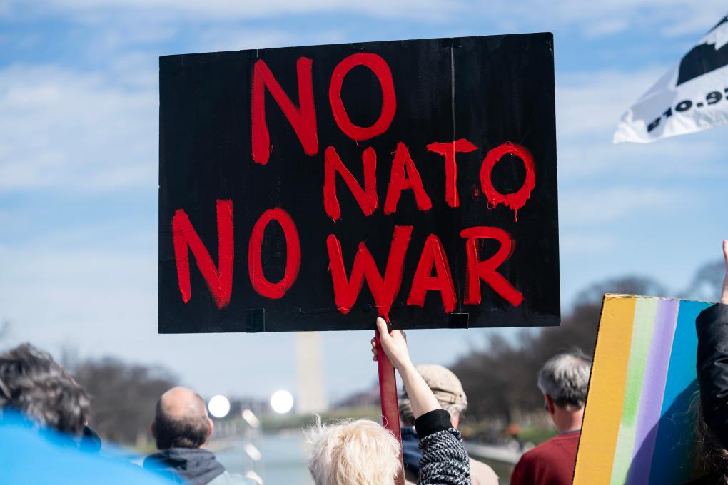 2023年2月19日,在美國首都華盛頓,一名抗議者手舉標語(yǔ)在林肯紀念堂前參加集會(huì )。新華社記者劉杰攝