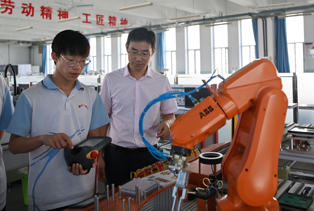 ↑天津市濱海新區塘沽第一職業(yè)中等專(zhuān)業(yè)學(xué)校教師(右)指導學(xué)生使用機械設備