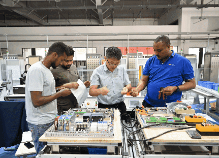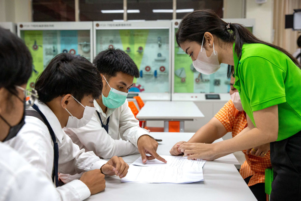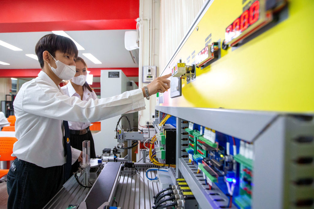 ↑泰國學(xué)生在大城技術(shù)學(xué)院內的魯班工坊學(xué)習交流