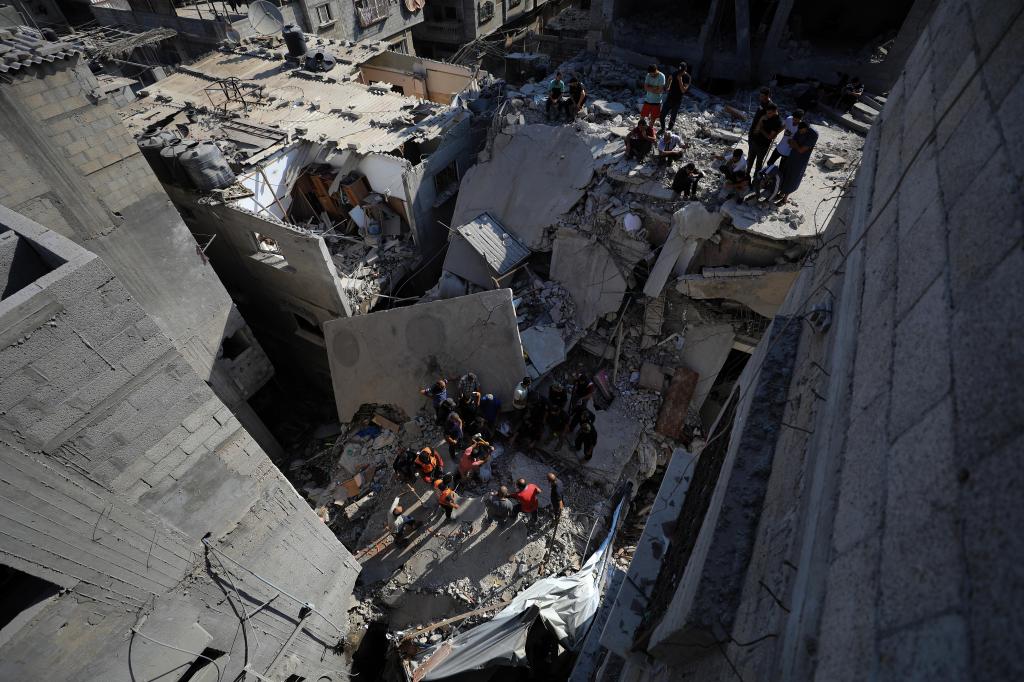 11月1日,在加沙地帶南部城市汗尤尼斯,人們在遭以色列襲擊后的建筑廢墟進(jìn)行搜救工作。新華社發(fā)(亞西爾·庫迪攝)