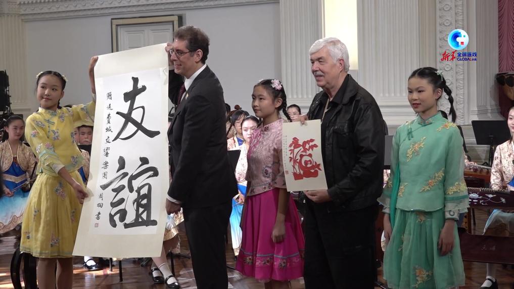 兩名少年兒童把在現場(chǎng)完成的寫(xiě)有“友誼”二字的書(shū)法作品和以熊貓為主題的剪紙作品,作為禮品贈送給費城交響樂(lè )團。