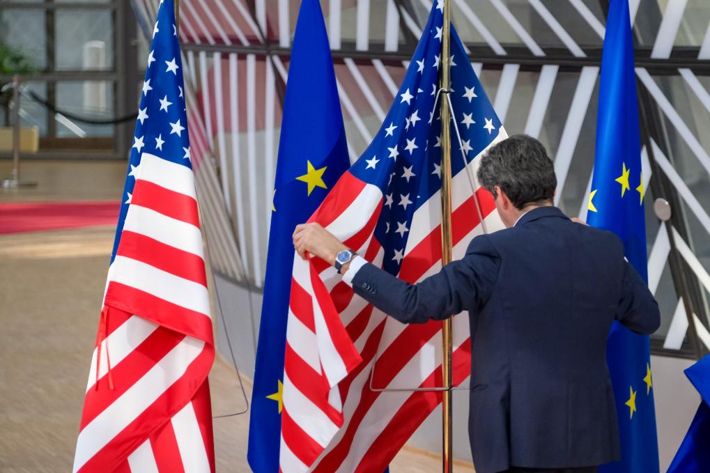 2022年3月24日,工作人員在比利時(shí)布魯塞爾的歐盟總部整理美國國旗。新華社記者張鋮攝