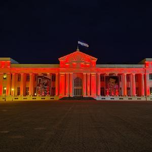 2022年1月31日,尼加拉瓜首都馬那瓜市中心標志性建筑國家宮點(diǎn)亮“中國紅”。新華社發(fā)(中國駐尼加拉瓜使館供圖)