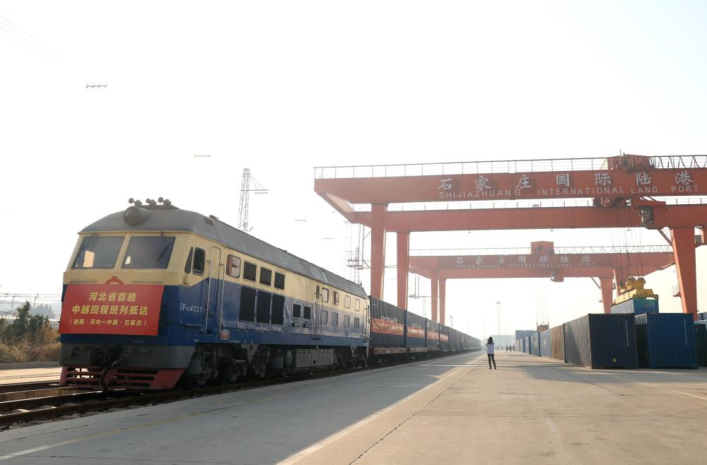 河北省首趟中越回程班列抵達石家莊國際陸港(2023年12月5日攝)。新華社發(fā)(梁子棟攝)