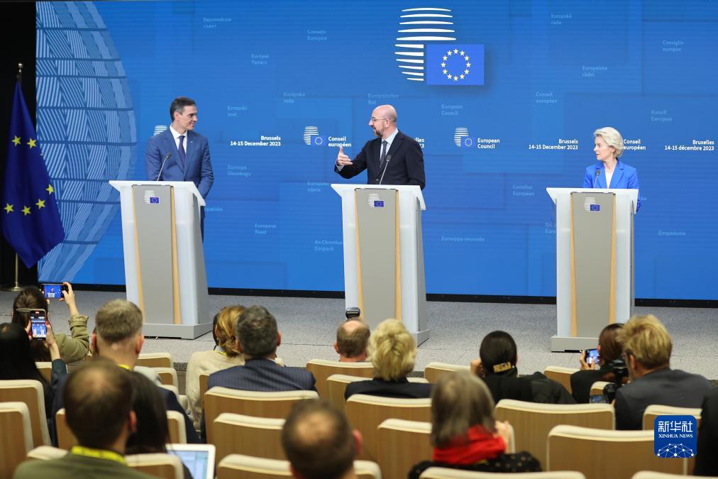 12月15日,在比利時(shí)布魯塞爾,歐洲理事會(huì )主席米歇爾(中)、歐盟委員會(huì )主席馮德萊恩(右)、西班牙首相桑切斯在歐盟峰會(huì )期間出席新聞發(fā)布會(huì )。新華社記者 趙丁喆 攝