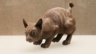 在廣東省博物館,有一個(gè)“石灣窯黃炳素胎金絲貓”,它出自清光緒年間陶塑名家黃炳之手。在“胎毛技法”的運用下,金絲貓的毛發(fā)纖毫可見(jiàn),加之其四肢緊繃、瞠目而視的捕獵姿態(tài),使這項文物宛若真貓,吸引不少游客前來(lái)打卡。